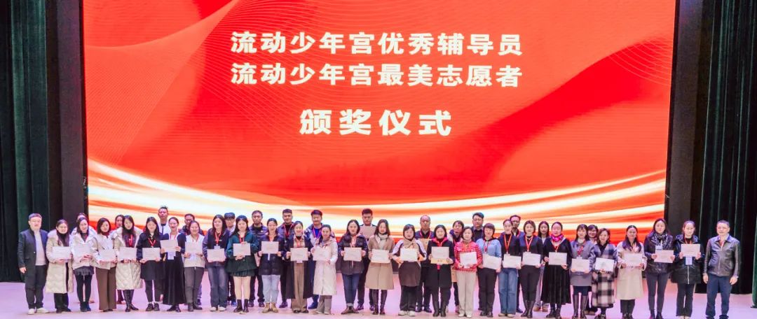 中国青少年宫协会副会长方健、中国青少年宫协会副秘书长陈敬为全国“流动少年宫”最美志愿者代表颁奖